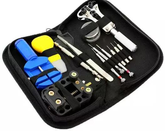Solid klockreparationsverktygssats – perfekt för mindre amatörreparationer i hemmet samt för att använda det i helt professionella klockverkstäder. Satsen innehåller alla oumbärliga delar som gör att du kan reparera eller förkorta ett armbandsur på en klocka och göra olika små reparationer av dina smycken och elektroniska enheter.  Uppsättningen innehåller:     1. justerbar nyckel, vridöppnare justerbar på botten för skruvar     2. praktisk uppsättning med 18 tips för öppnare / vridknapp     3. bekväm justerbar gripare (klämma) för att fästa klockor     4. 0,70 mm armbandsstans     5. 0,80 mm armbandsstans     6. 1,00 mm armbandsstans     7. exakt pincett med fin punkt     8. ideal teleskopdragare     9. användbara verktyg för att ta bort länkar / förkorta armband     10. kniv för att öppna tryckstängda lock     11. Ställ in 3x platta skruvmejslar med utbytbara spetsar    Hela uppsättningen är förpackad i ett mycket praktiskt fodral, stängt med dragkedja. Väskan har ett praktiskt band som gör att du enkelt och säkert kan transportera hela reparationssetet. Verktygssatsen kan hållas i din hand eller säkert hängas på handleden. Varje del av satsen har sin plats i fodralet vilket garanterar att du inte tappar, blandar eller skadar något tillbehör samtidigt som du har supersnabb tillgång för att få det du behöver vid en given tidpunkt. Du kommer bara att använda en hand för att få det urmakare du behöver (t.ex. när du håller en klocka i en annan hand).